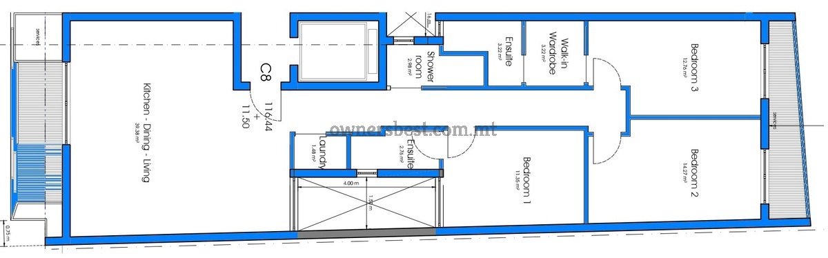 Third floor APARTMENT served with lift and is being sold finished excluding bathrooms and doors. Layout comprises of an open plan kitchen/living/dining, a front terrace, bathroom, 3 bedrooms, 2 ensuites, walkin, laundry room and a back balcony. Freehold.